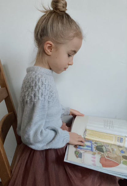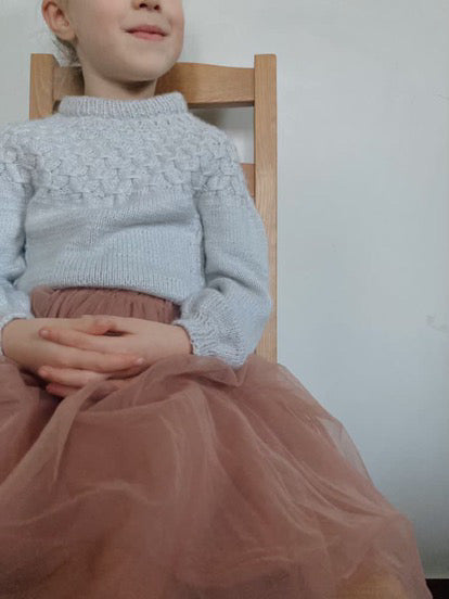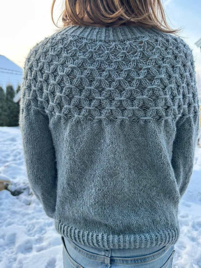 Filato suggerito: Haya by Holstgarn (70% baby alpaca 20% Mulberry silk 10% yak), 50g / 183 m. In alternativa può essere utilizzato un filato fingering / 4-ply / Super Fine \n \nQuantità di filato stimata: 3 (4) 5 (5) 5 (6) 6 (6) matasse \n \nFerri: 4.00 mm e 3.5 mm \n \nCavi: 40 cm, 60 cm, 80 cm, 100 cm \n \nMarcapunti (4) \n \nCampione (10cm x 10cm): 21 maglie x 26 righe con punte di 4,0 mm (US 6) a maglia rasata